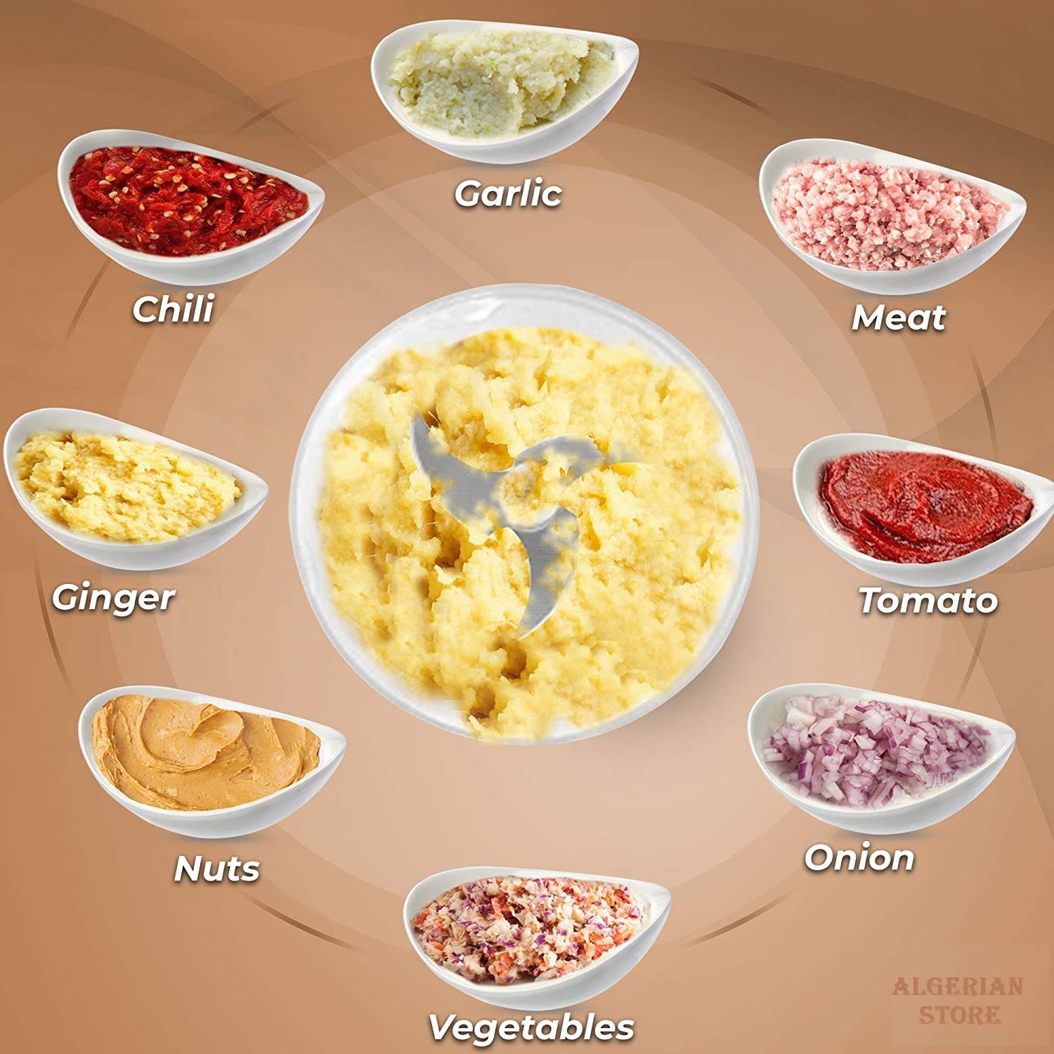 ⇒ Multifunction: About 250ml, with 3 sharp blades, it can chop garlic, ginger, peppers, vegetables, fruits, meats and more. A small chopper is also easy for you to store.